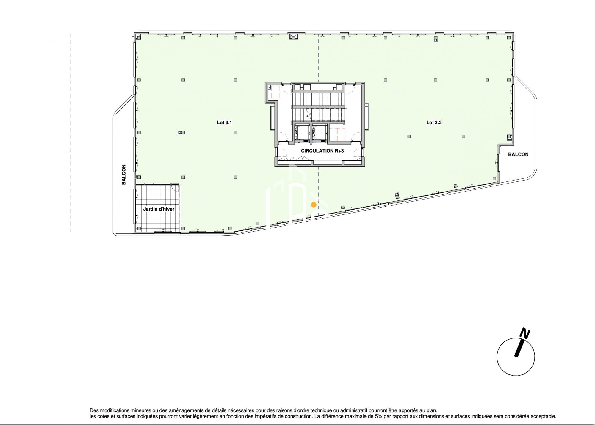 - Plateau de bureaux livré brut non cloisonné de 670 m2 environ, divisible en 2 plateaux (320 m2 et 297 m2), et 52 m² environ de parties communes.
